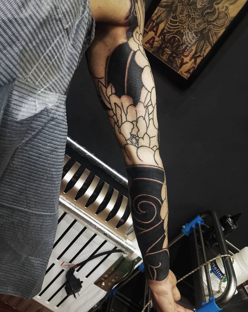 当前位置: 首页 >贵州省贵阳市纹身店-贵阳魔魂刺青纹身图案>花臂未完成期待完成关注我纹身图片_老传统纹身图案