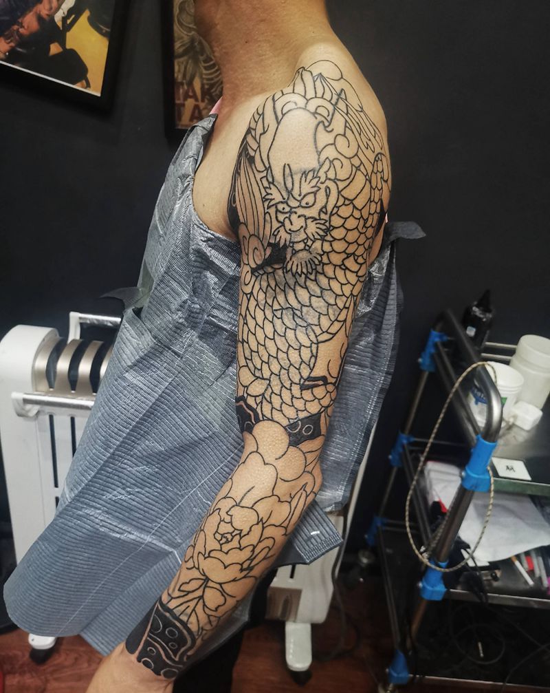 当前位置: 首页 >贵州省贵阳市纹身店-贵阳魔魂刺青纹身图案>花臂未完成期待完成关注我纹身图片_老传统纹身图案