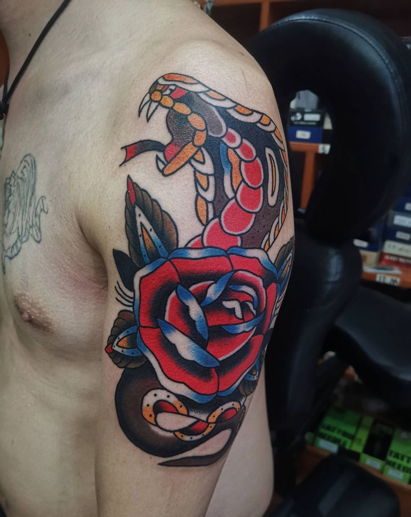 当前位置: 首页 >贵州省贵阳市纹身店-贵阳魔魂刺青纹身图案>OLDschool花蛇纹身图片_Old School纹身图案