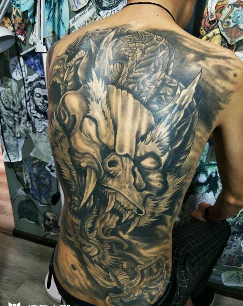 当前位置: 首页 >贵州省贵阳市纹身店-贵阳魔魂刺青纹身图案>满背恶龙恢复后纹身图片