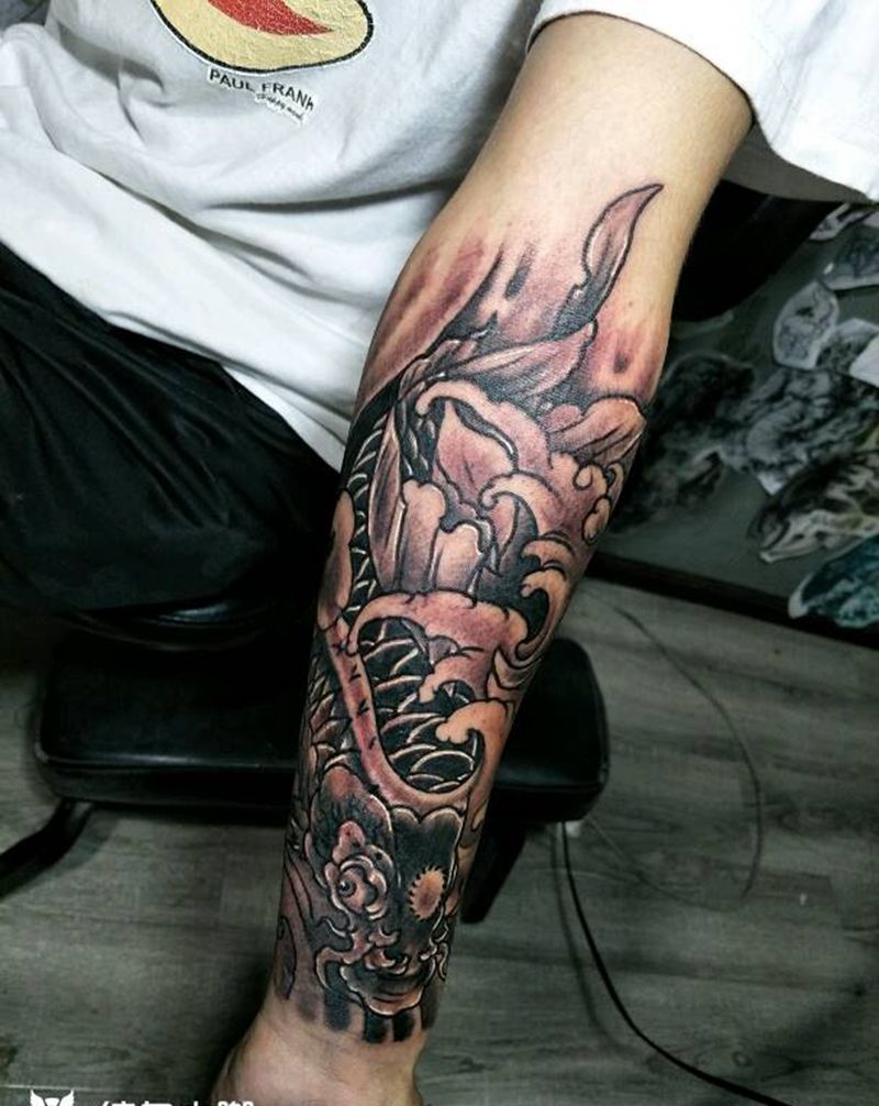 • T网红王老大花腿龙纹身图片_腿部新传统纹身图案