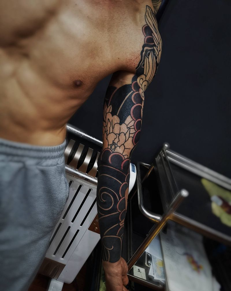 当前位置: 首页 >贵州省贵阳市纹身店-贵阳魔魂刺青纹身图案>老传统花臂未完成下次继续纹身图片_老传统纹身图案