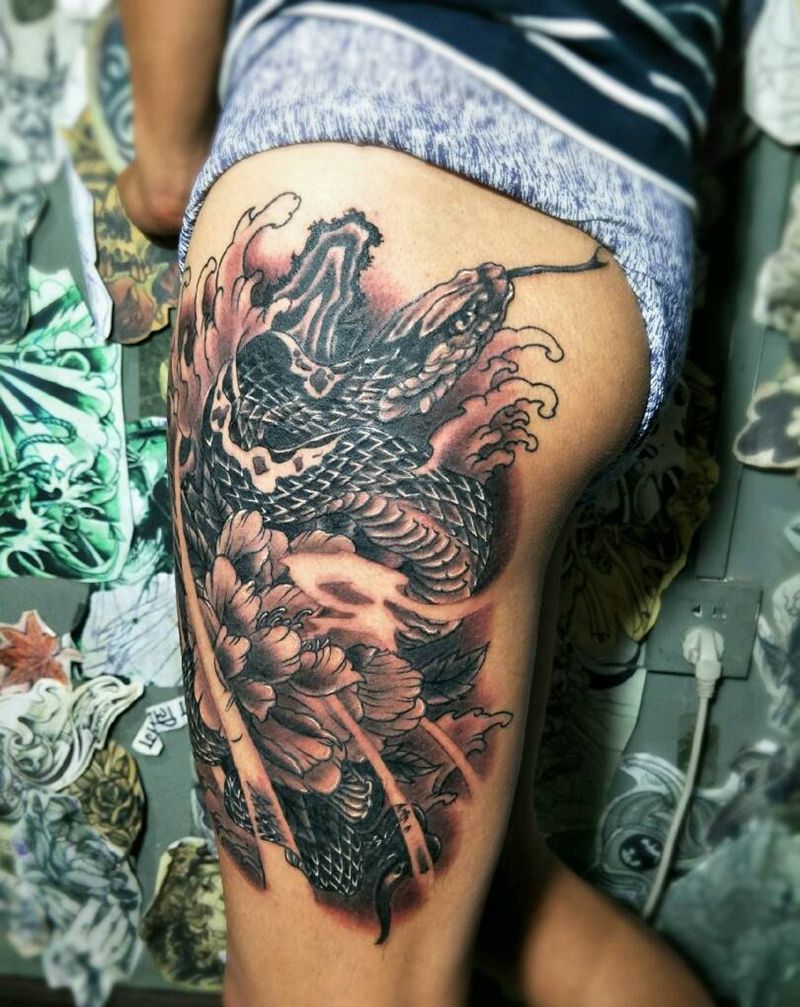 • T网红王老大花腿龙纹身图片_腿部新传统纹身图案