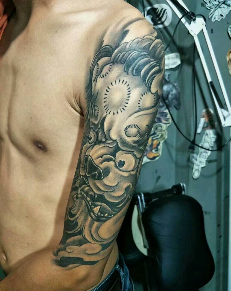 当前位置: 首页 >贵州省贵阳市纹身店-贵阳魔魂刺青纹身图案>唐狮纹身图片