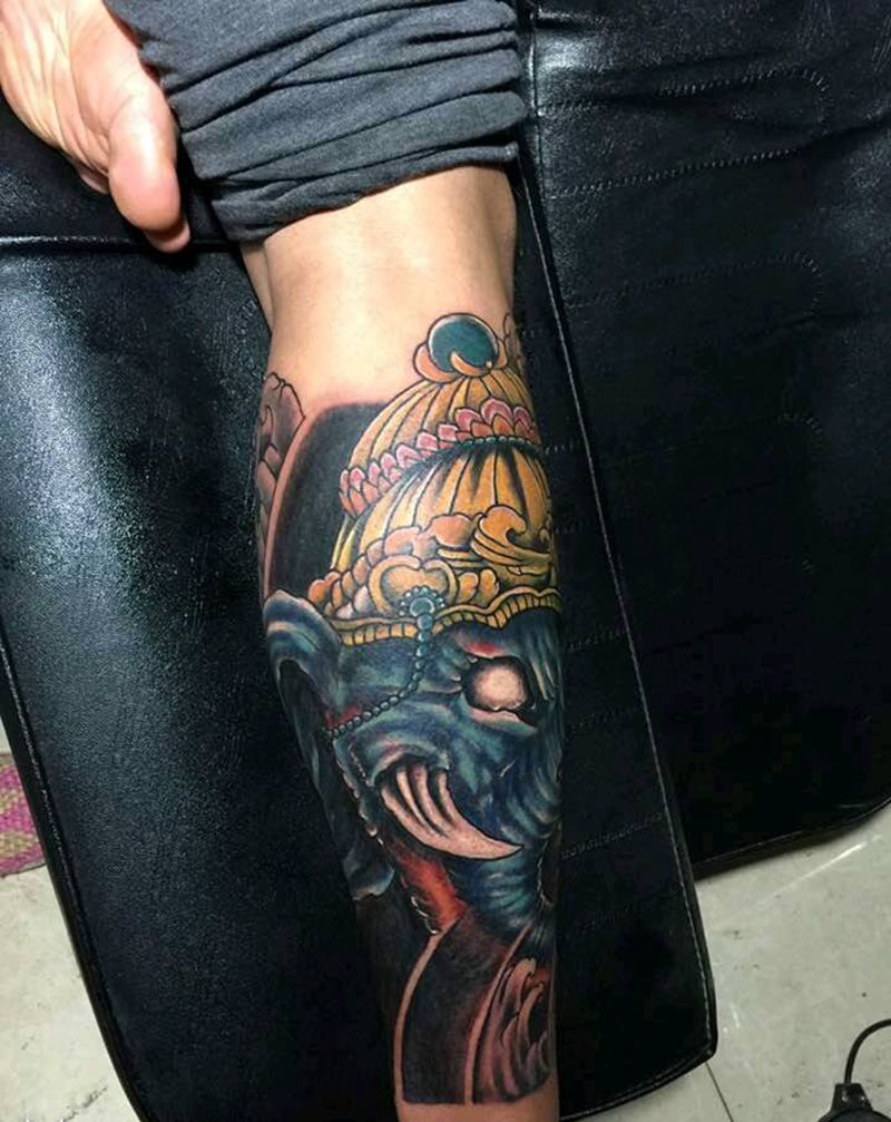 当前位置: 首页 >贵州省贵阳市纹身店-贵阳魔魂刺青纹身图案>象神纹身图片_腿部传统动物成品纹身图案
