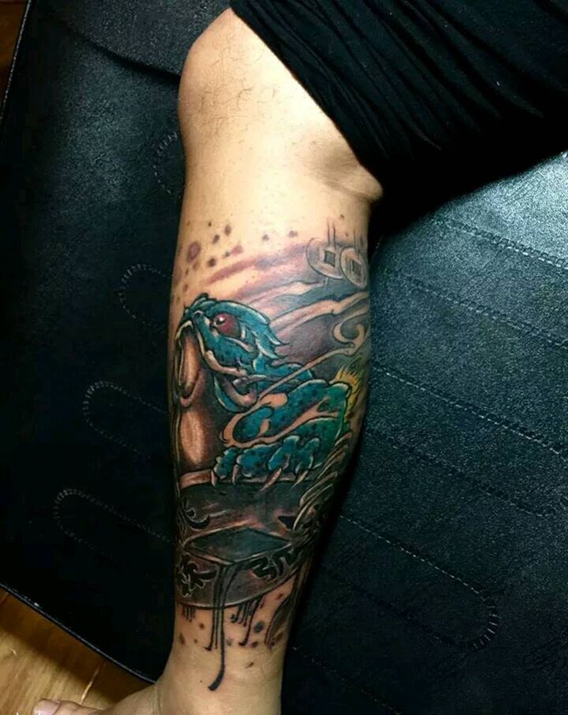 • T网红王老大花腿龙纹身图片_腿部新传统纹身图案