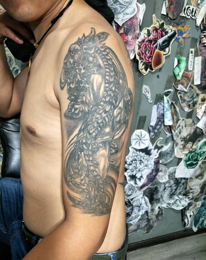 • T网红王老大花腿龙纹身图片_腿部新传统纹身图案