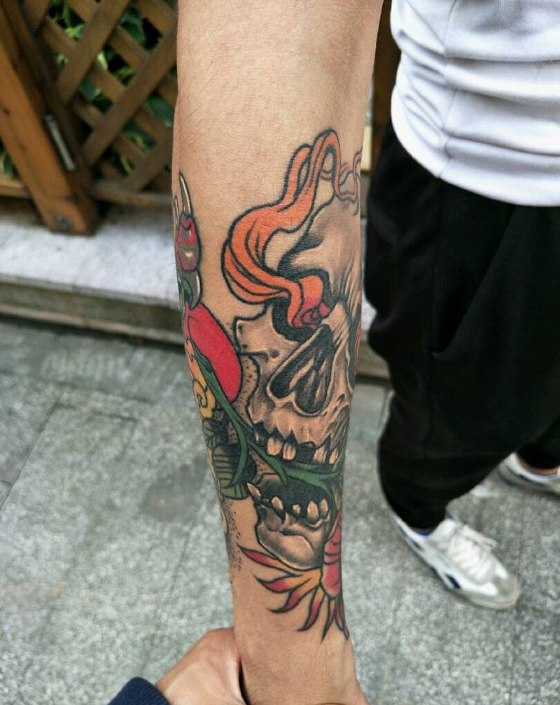 • T包小腿吹火男+阿多福纹身图片_腿部老传统新传统吹火男阿