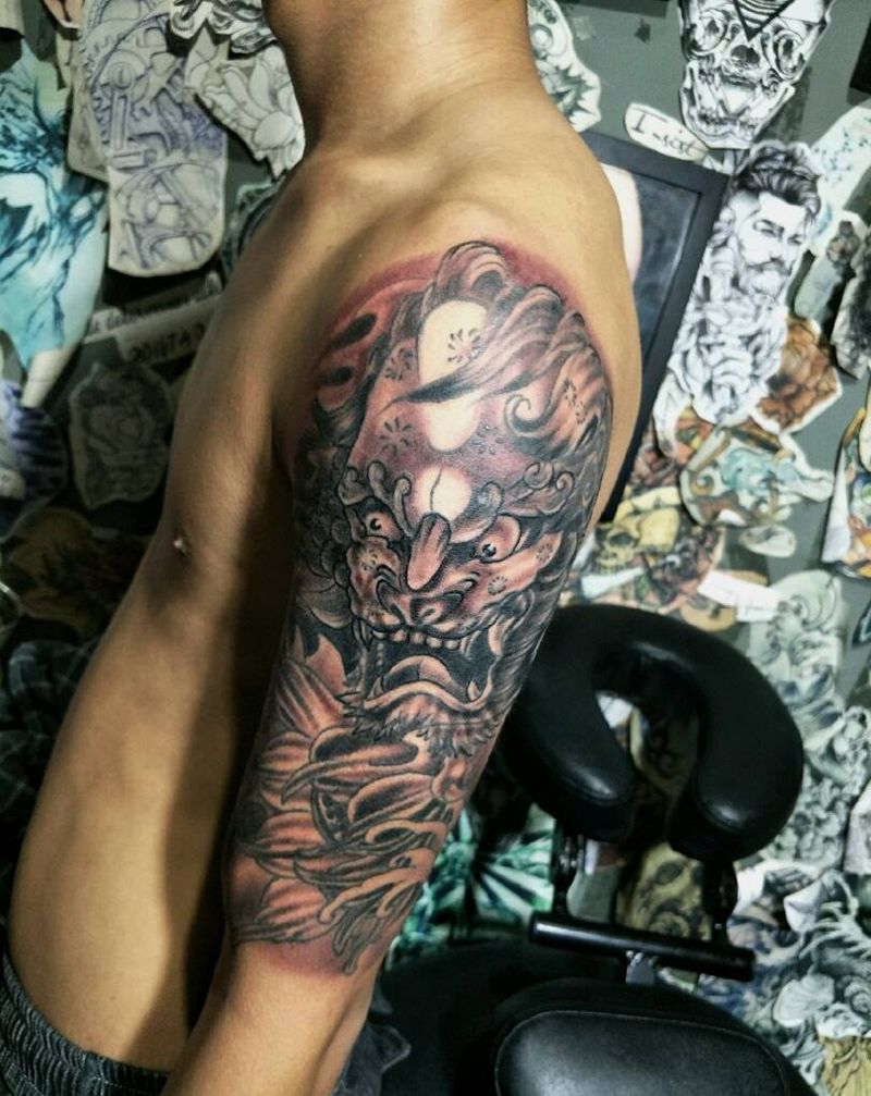 当前位置: 首页 >贵州省贵阳市纹身店-贵阳魔魂刺青纹身图案>唐狮子完成纹身图片
