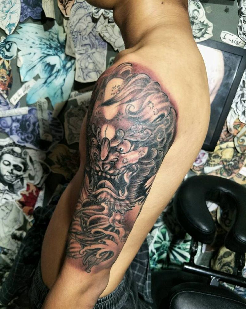 当前位置: 首页 >贵州省贵阳市纹身店-贵阳魔魂刺青纹身图案>唐狮子完成纹身图片
