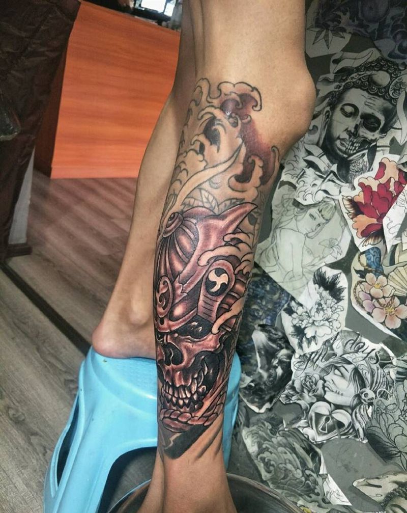 当前位置: 首页 >贵州省贵阳市纹身店-贵阳魔魂刺青纹身图案>包小腿鬼武士三次完成,纹身图片