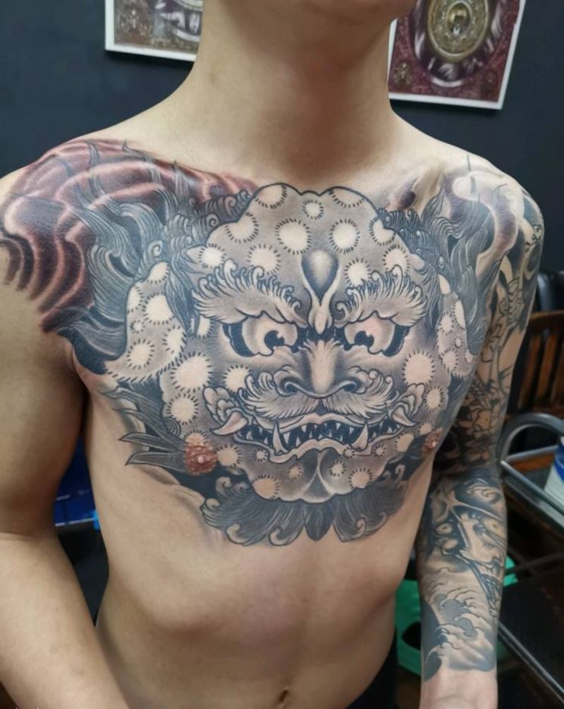 当前位置: 首页 >贵州省贵阳市纹身店-贵阳魔魂刺青纹身图案>V胸唐狮完成纹身图片_新传统纹身图案
