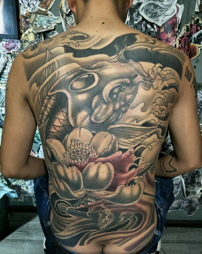 当前位置: 首页 >贵州省贵阳市纹身店-贵阳魔魂刺青纹身图案>满背鲤鱼完成6次总时间38小时纹身图片