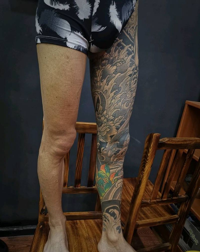 • T网红王老大花腿龙纹身图片_腿部新传统纹身图案