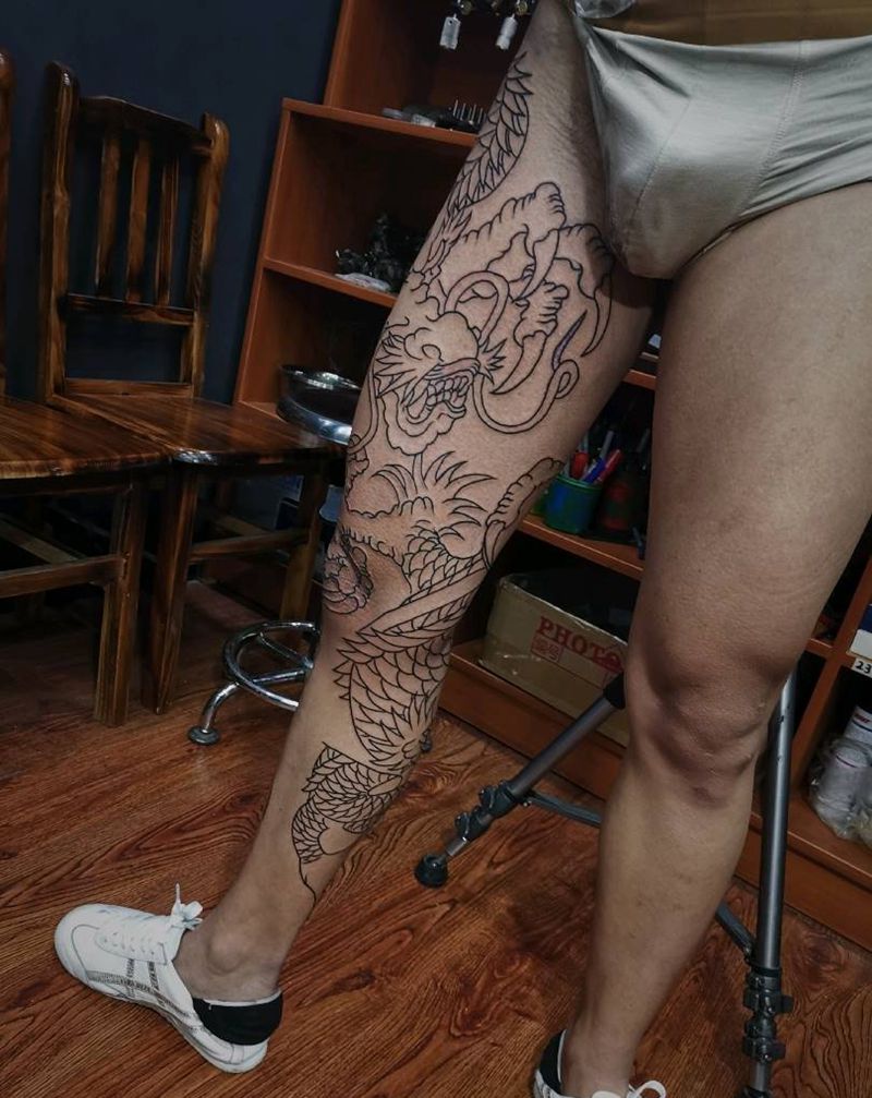 • T网红王老大花腿龙纹身图片_腿部新传统纹身图案