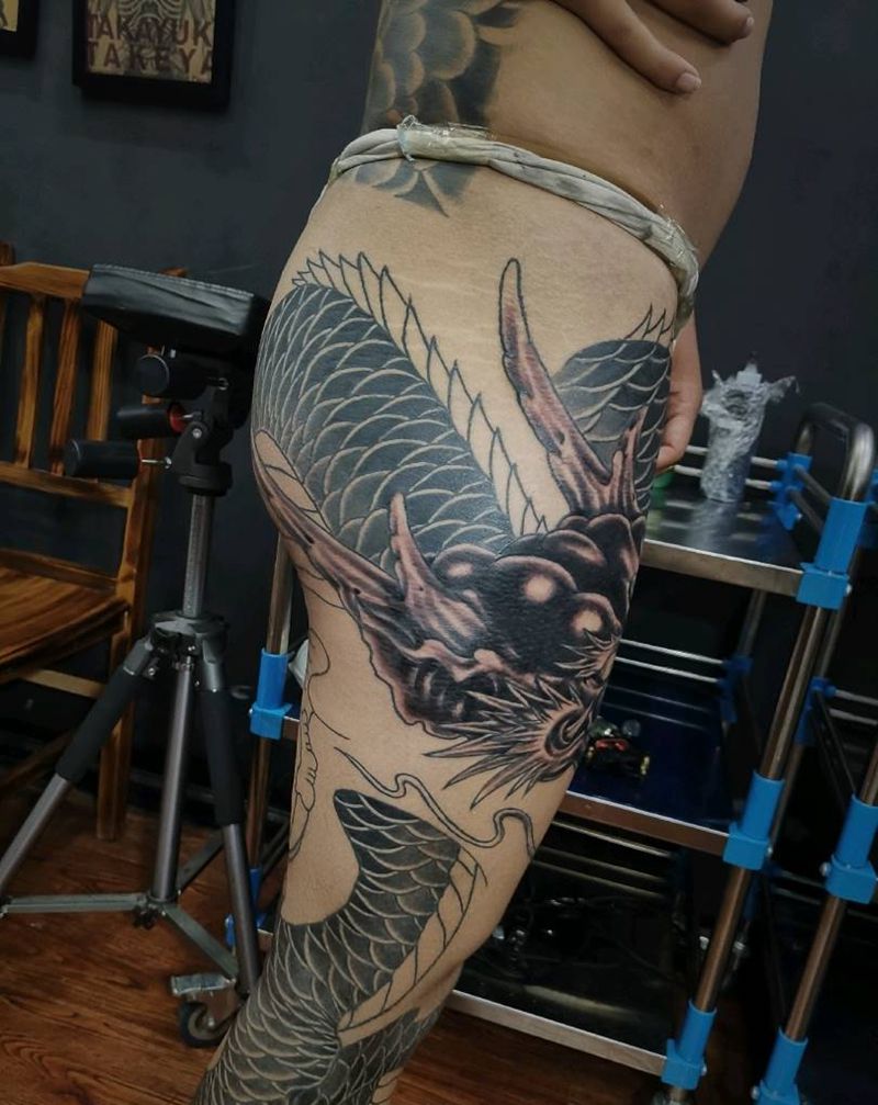 • T网红王老大花腿龙纹身图片_腿部新传统纹身图案