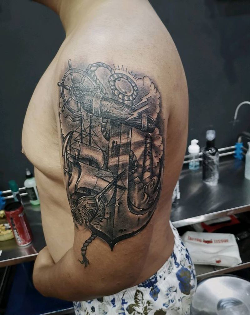 船锚纹身图片_欧美黑灰纹身图案