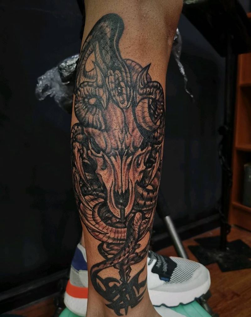 • T网红王老大花腿龙纹身图片_腿部新传统纹身图案