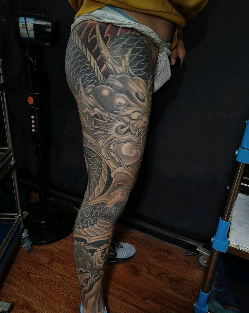 • T网红王老大花腿龙纹身图片_腿部新传统纹身图案