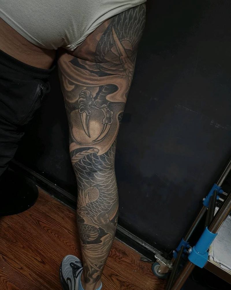 • T网红王老大花腿龙纹身图片_腿部新传统纹身图案