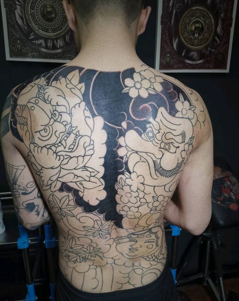 当前位置: 首页 >贵州省贵阳市纹身店-贵阳魔魂刺青纹身图案>满背遮盖未完成纹身图片_老传统纹身图案