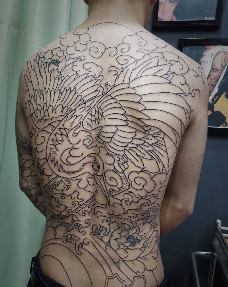满背丹顶鹤未完成纹身图片_新传统纹身图案