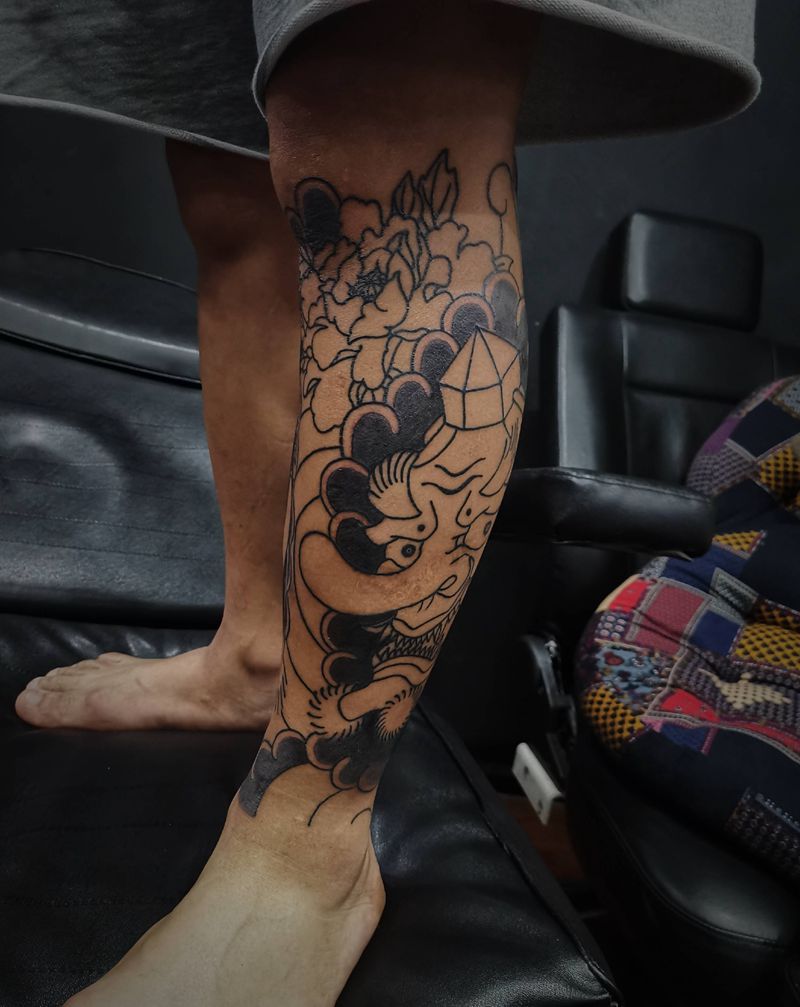 • T网红王老大花腿龙纹身图片_腿部新传统纹身图案