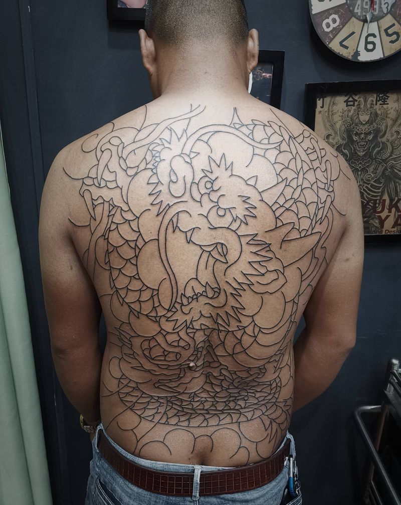当前位置: 首页 >贵州省贵阳市纹身店-贵阳魔魂刺青纹身图案>满背未完成纹身图片_老传统纹身图案