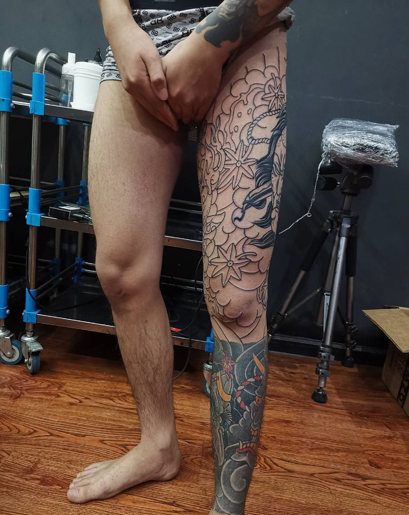 • T网红王老大花腿龙纹身图片_腿部新传统纹身图案