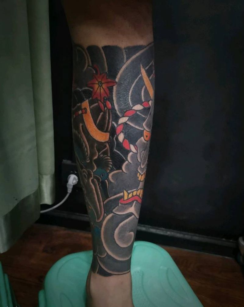 当前位置: 首页 >贵州省贵阳市纹身店-贵阳魔魂刺青纹身图案>包小腿完成,加黑板纹身图片_老传统纹身图案