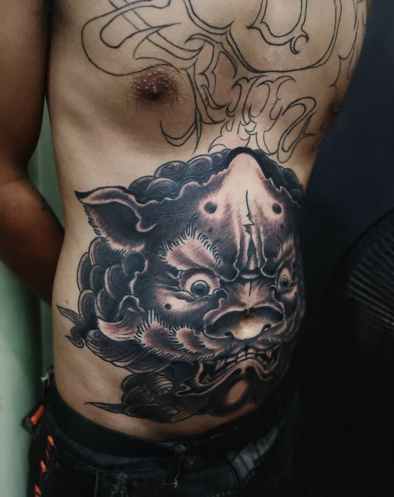 当前位置: 首页 >贵州省贵阳市纹身店-贵阳魔魂刺青纹身图案>唐狮纹身图片_老传统纹身图案