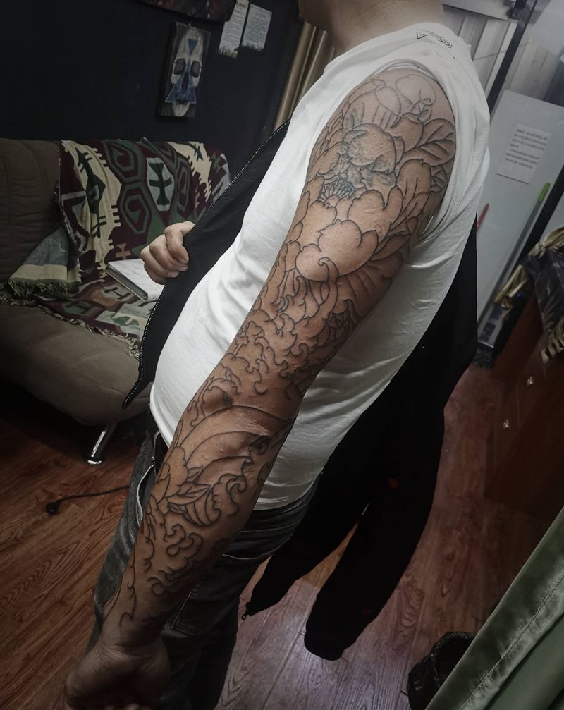 当前位置: 首页 >贵州省贵阳市纹身店-贵阳魔魂刺青纹身图案>花臂未完成下次继续纹身图片_新传统纹身图案