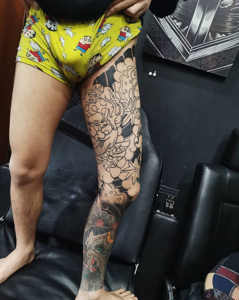 • T网红王老大花腿龙纹身图片_腿部新传统纹身图案