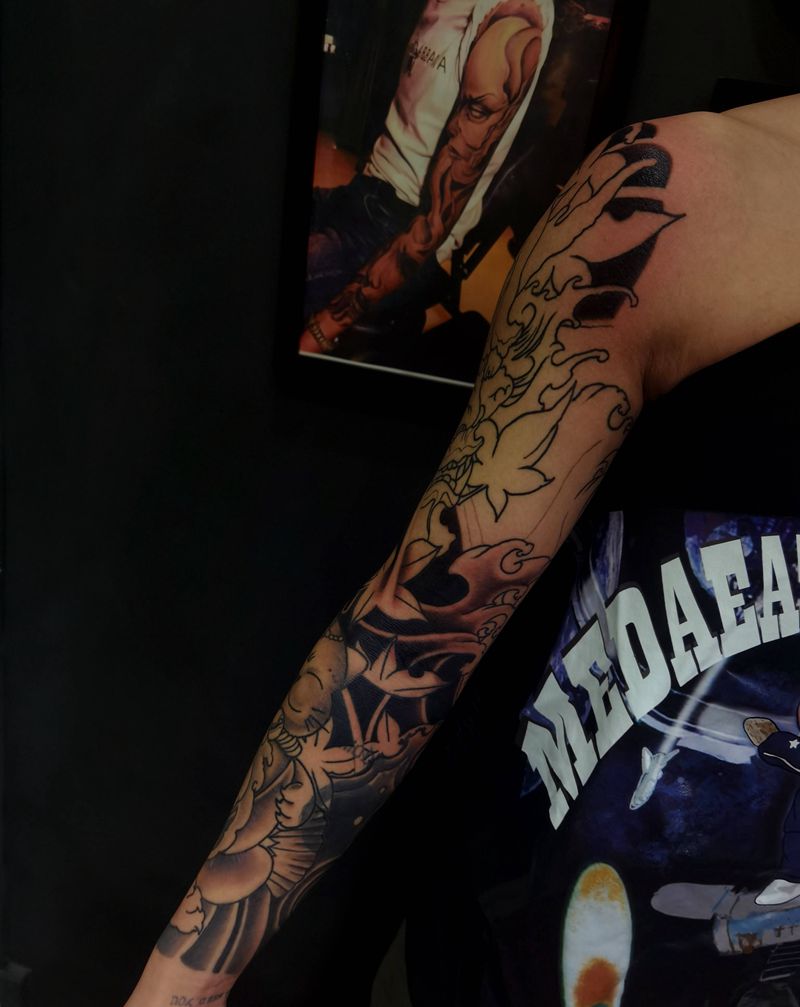 当前位置: 首页 >贵州省贵阳市纹身店-贵阳魔魂刺青纹身图案>般若招财猫花臂纹身图片_手臂新传统纹身图案