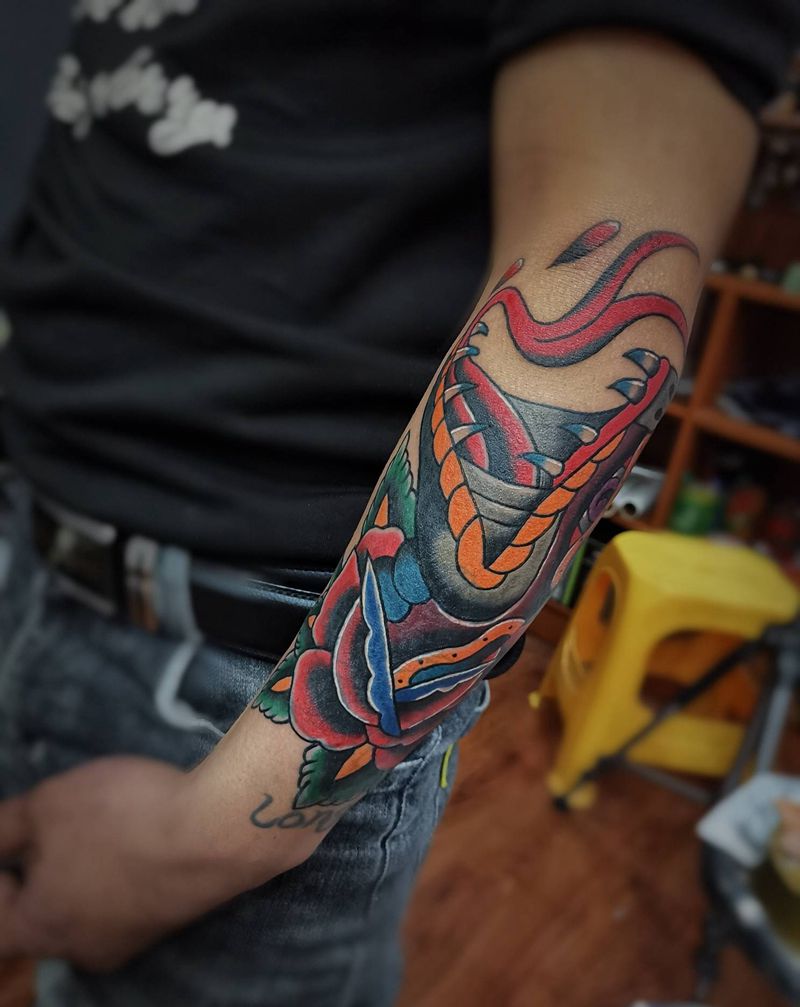 当前位置: 首页 >贵州省贵阳市纹身店-贵阳魔魂刺青纹身图案>蛇遮盖纹身图片_Old School纹身图案