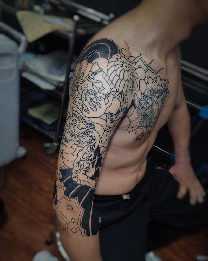 • T网红王老大花腿龙纹身图片_腿部新传统纹身图案