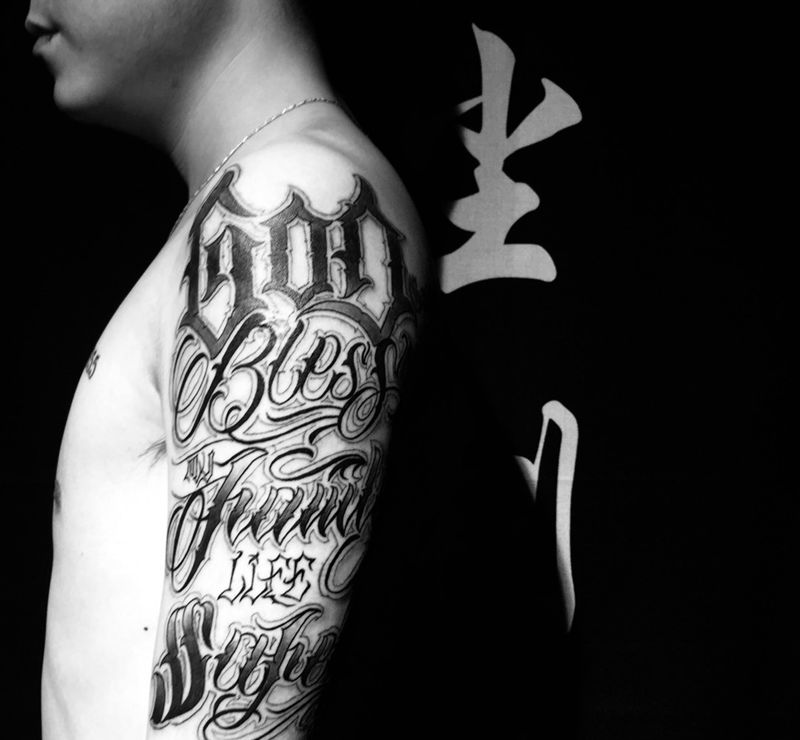 当前位置: 首页 >贵州省遵义市纹身店-墨尘刺青处纹身图案>奇卡诺花体纹身图片_成品手稿欧美插画手臂字符原创纹身图案