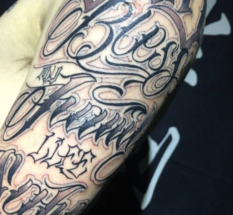 当前位置: 首页 >贵州省遵义市纹身店-墨尘刺青处纹身图案>奇卡诺花体纹身图片_成品手稿欧美插画手臂字符原创纹身图案
