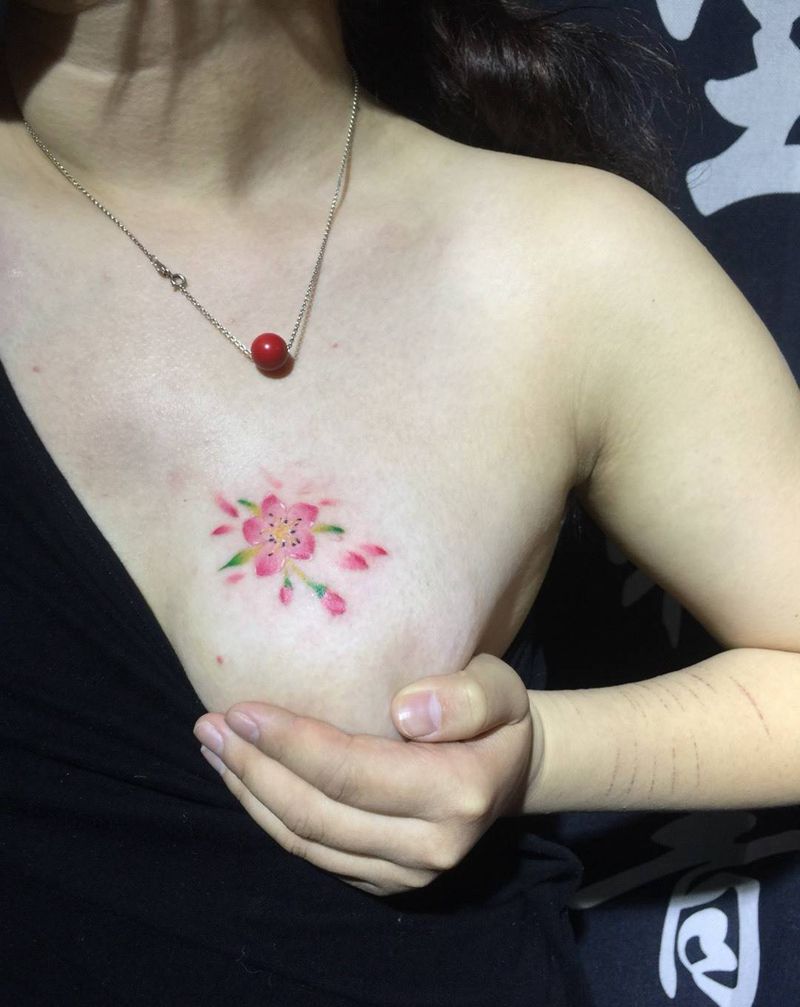 美女樱花纹身纹身图片_成品胸部清新植物纹身图案