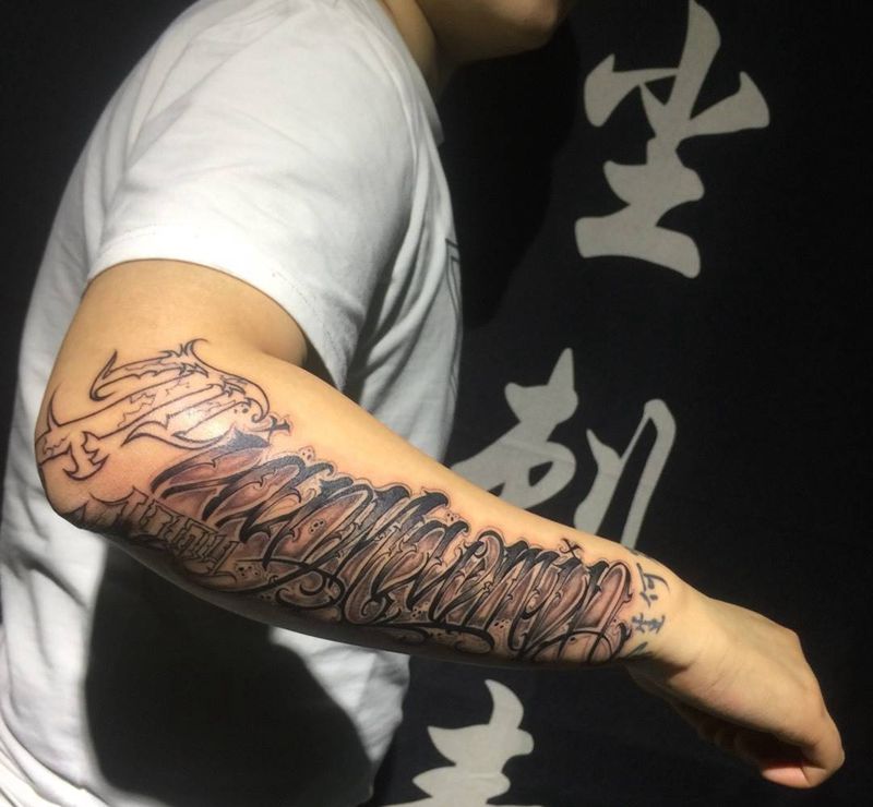 当前位置: 首页 >贵州省遵义市纹身店-墨尘刺青处纹身图案>奇卡诺花体纹身图片_成品手稿手臂欧美几何字符原创纹身图案