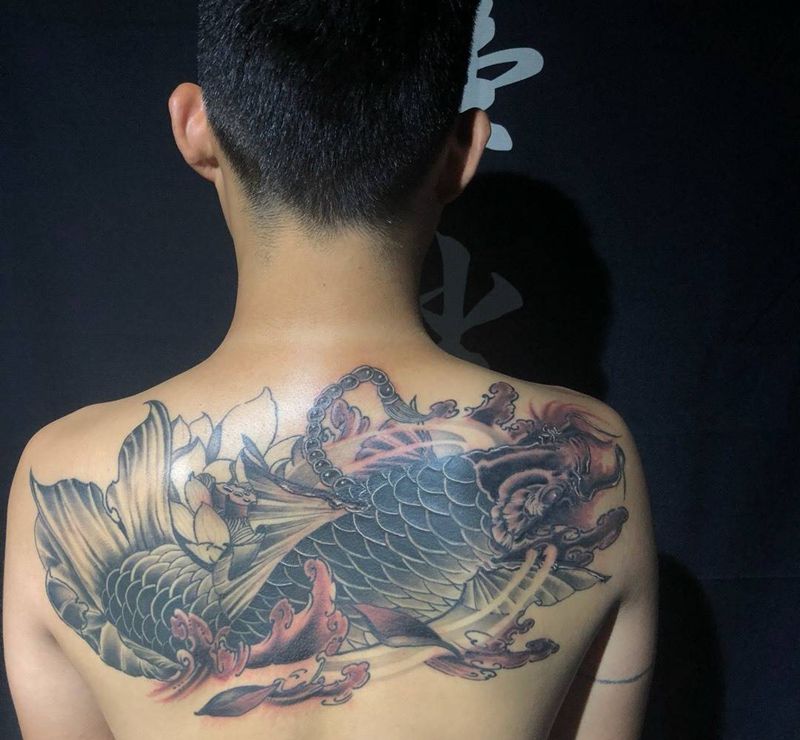 遮盖作品纹身图片_肩部背部新传统锦鲤纹身图案