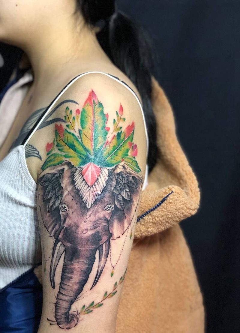 当前位置: 首页 >贵州省遵义市纹身店-墨尘刺青处纹身图案>大象纹身图片_肩部手臂欧美写实水彩纹身图案
