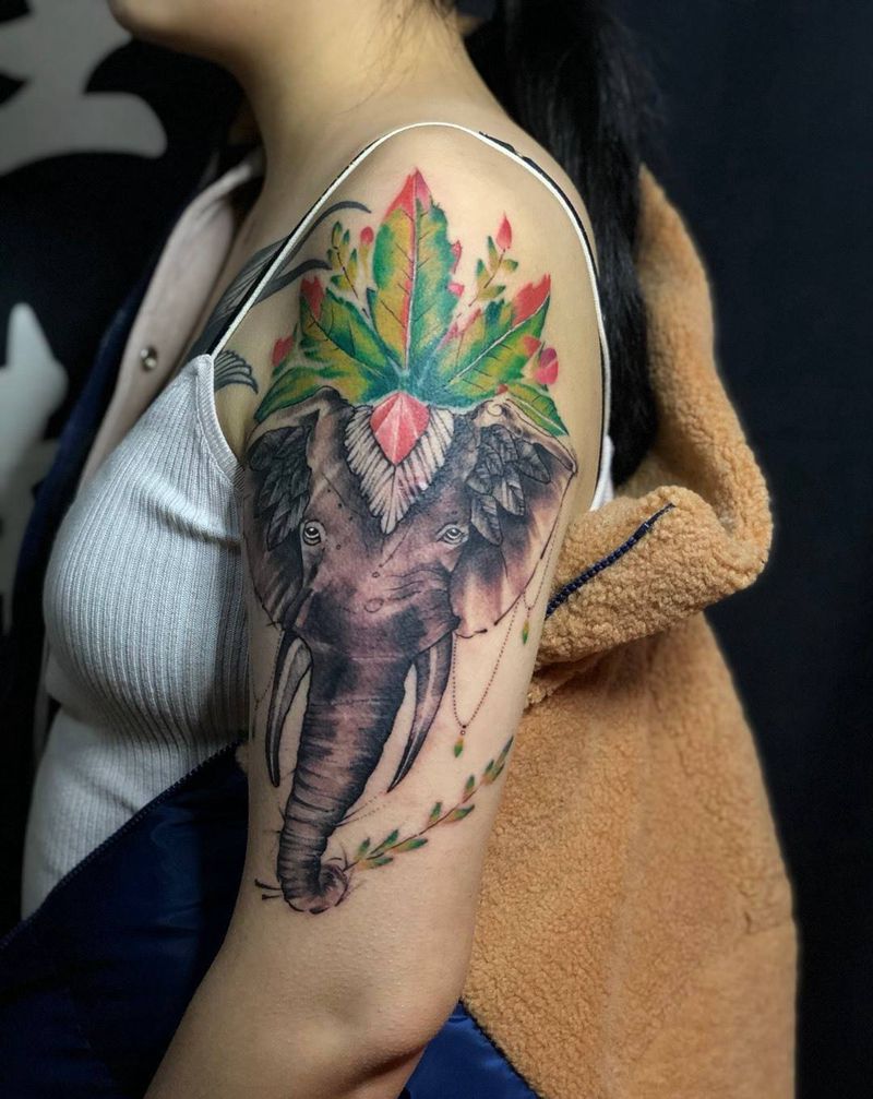 大象纹身图片_肩部手臂欧美写实水彩纹身图案
