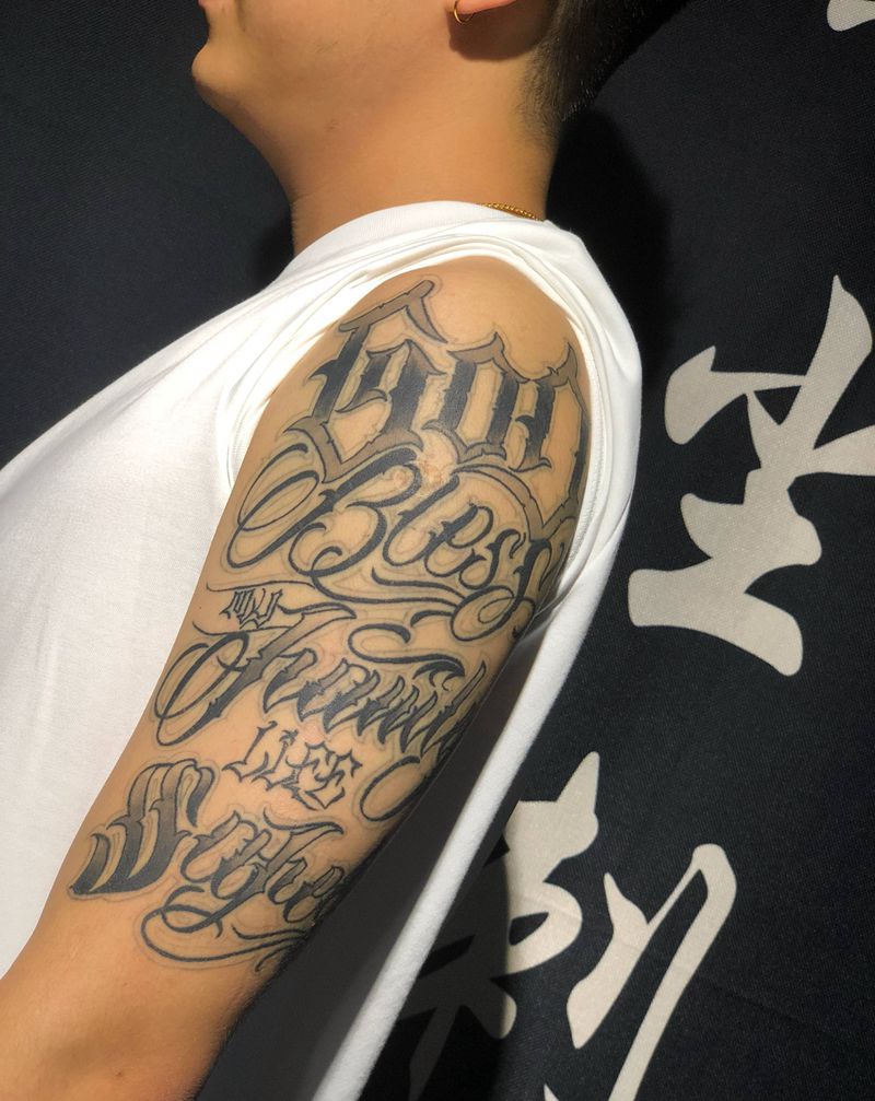 当前位置: 首页 >贵州省遵义市纹身店-墨尘刺青处纹身图案>奇卡诺花体纹身图片_肩部手臂花体字纹身图案
