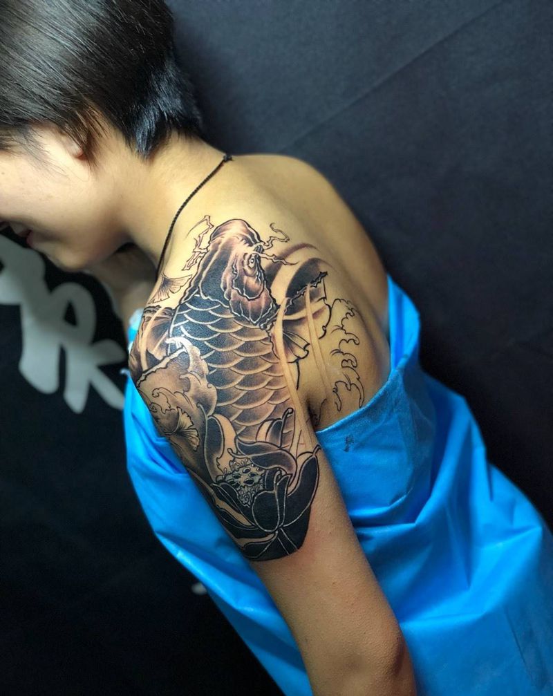 遮盖作品纹身图片_肩部背部新传统鲤鱼遮盖美女纹身图案
