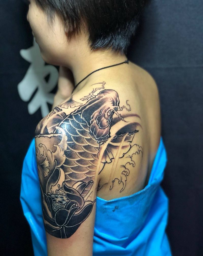 遮盖作品纹身图片_肩部背部新传统鲤鱼遮盖美女纹身图案