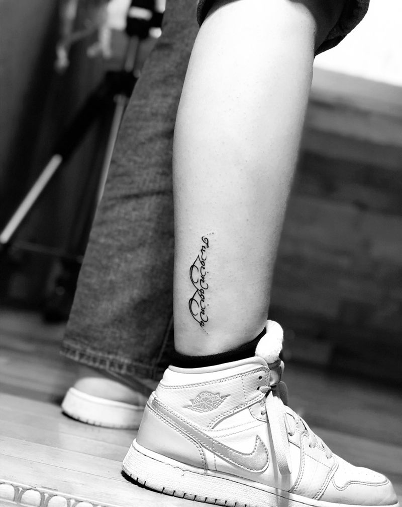 当前位置: 首页 >贵州省遵义市纹身店-墨尘刺青处纹身图案>英文纹身图片_脚部腿部欧美写实花体字纹身图案