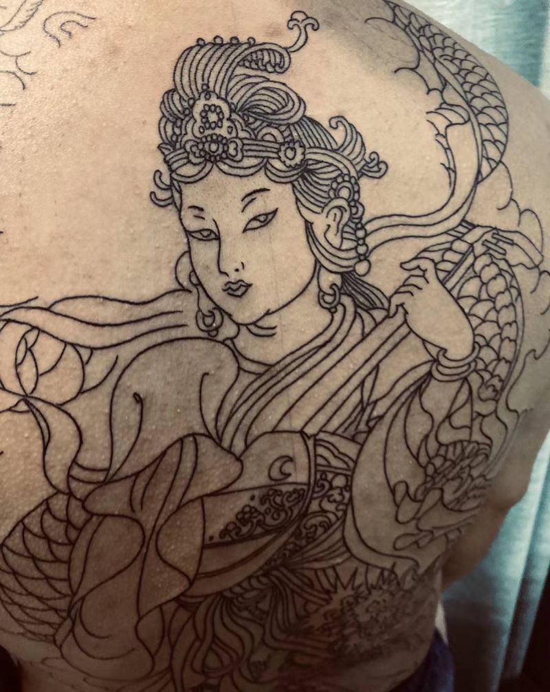 当前位置: 首页 >贵州省遵义市纹身店-够刺青纹身图案>观音满背/第一阶段纹身图片_背部老传统观音纹身图案