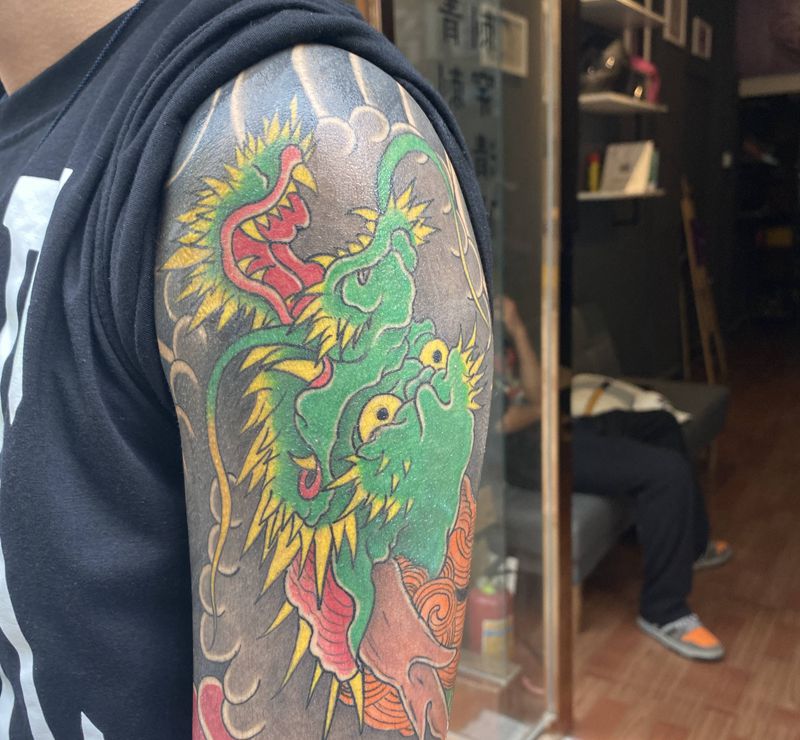 • T网红王老大花腿龙纹身图片_腿部新传统纹身图案
