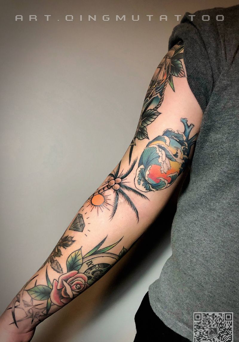 当前位置: 首页 >贵州省毕节市纹身店-青木刺青処纹身图案>School花臂拼接未完纹身图片_手臂Old School纹身图案